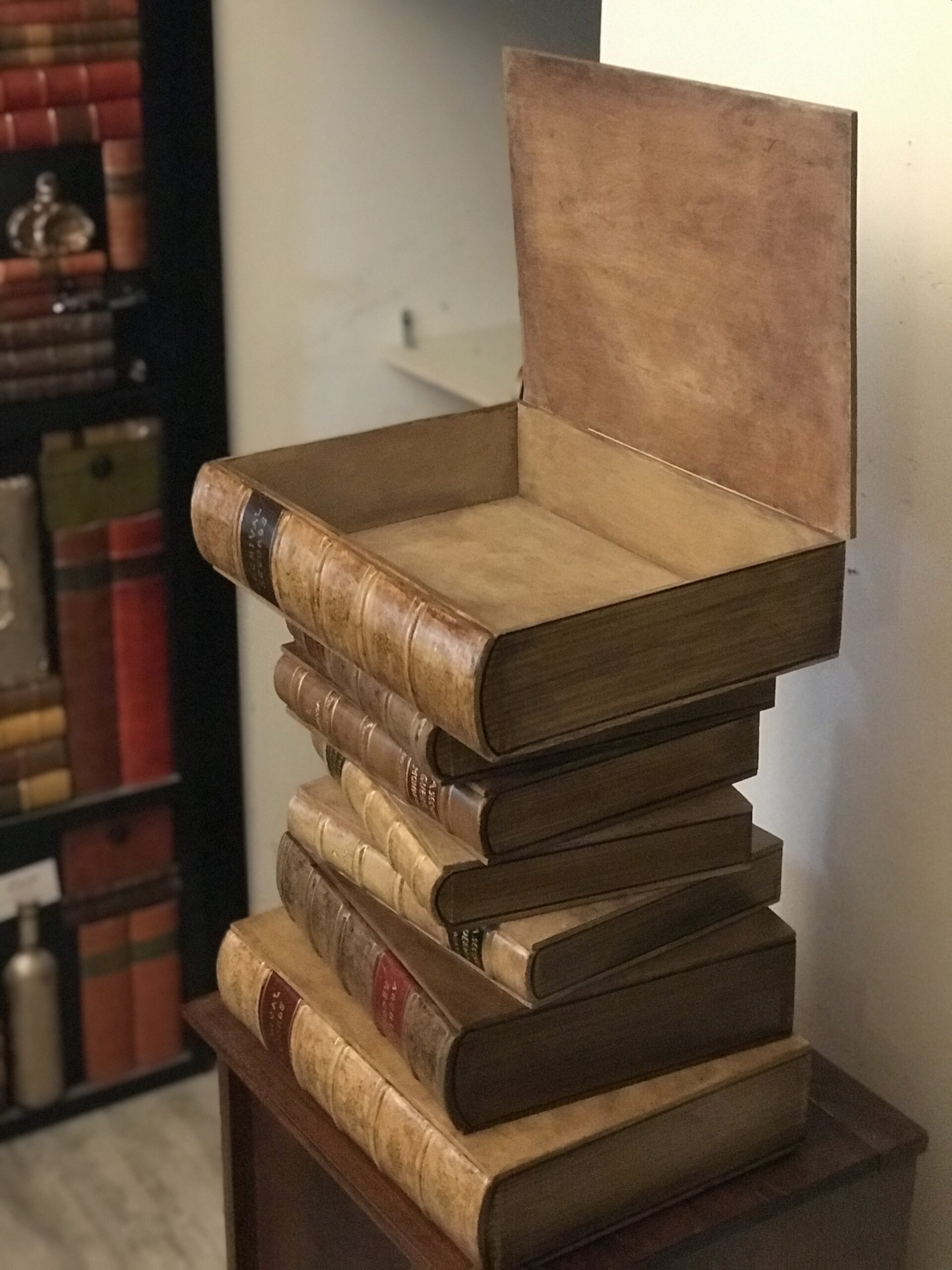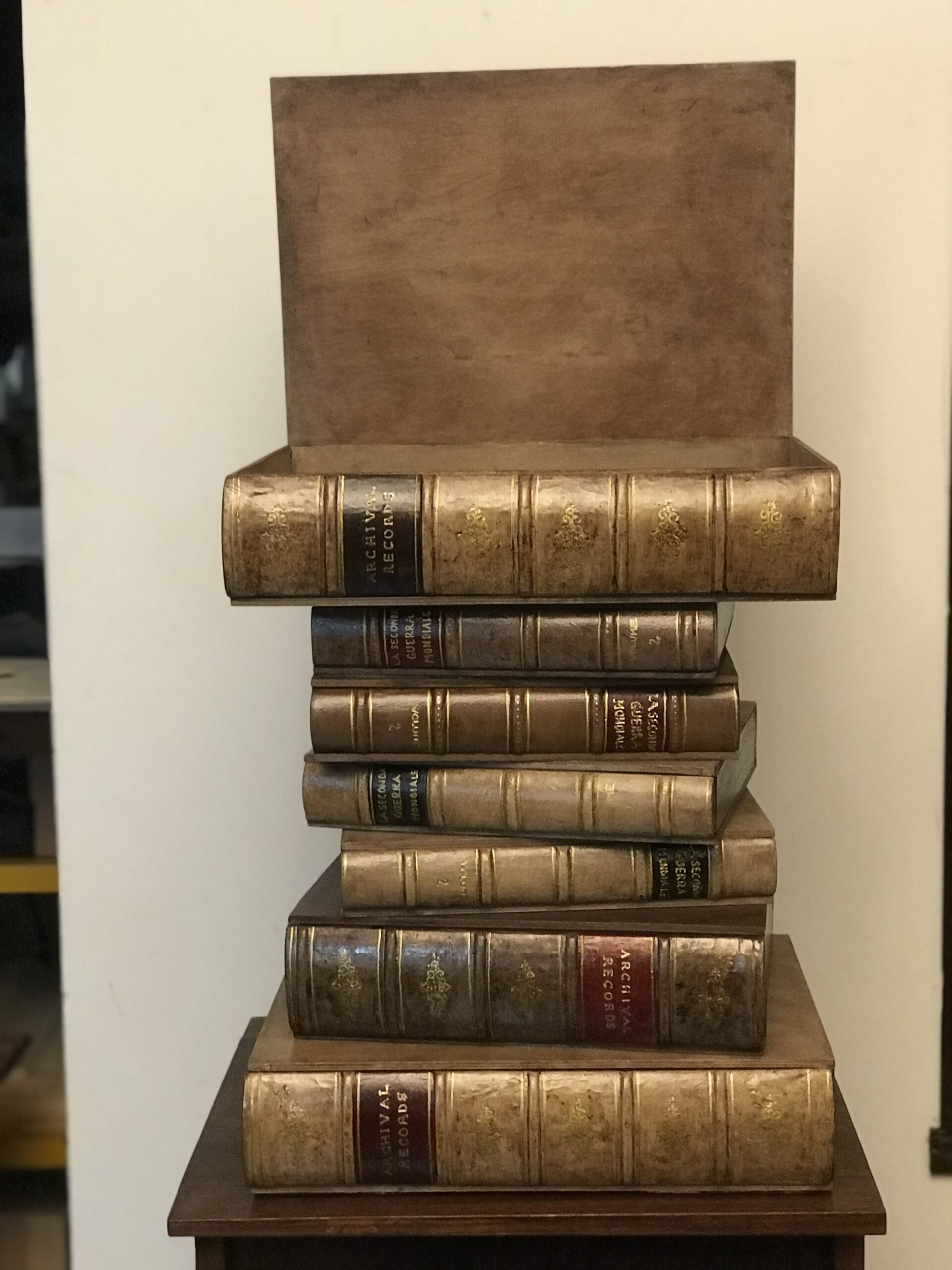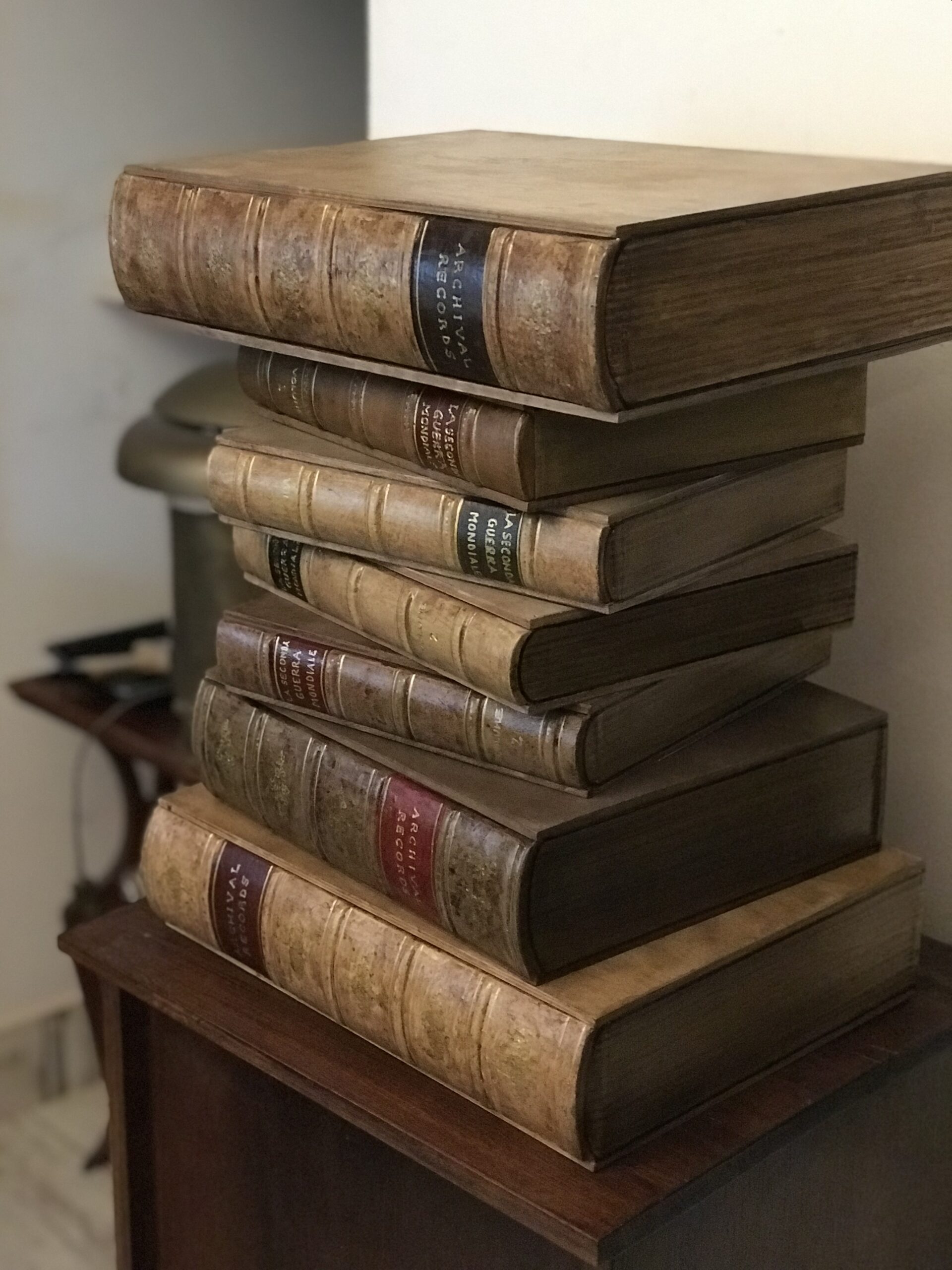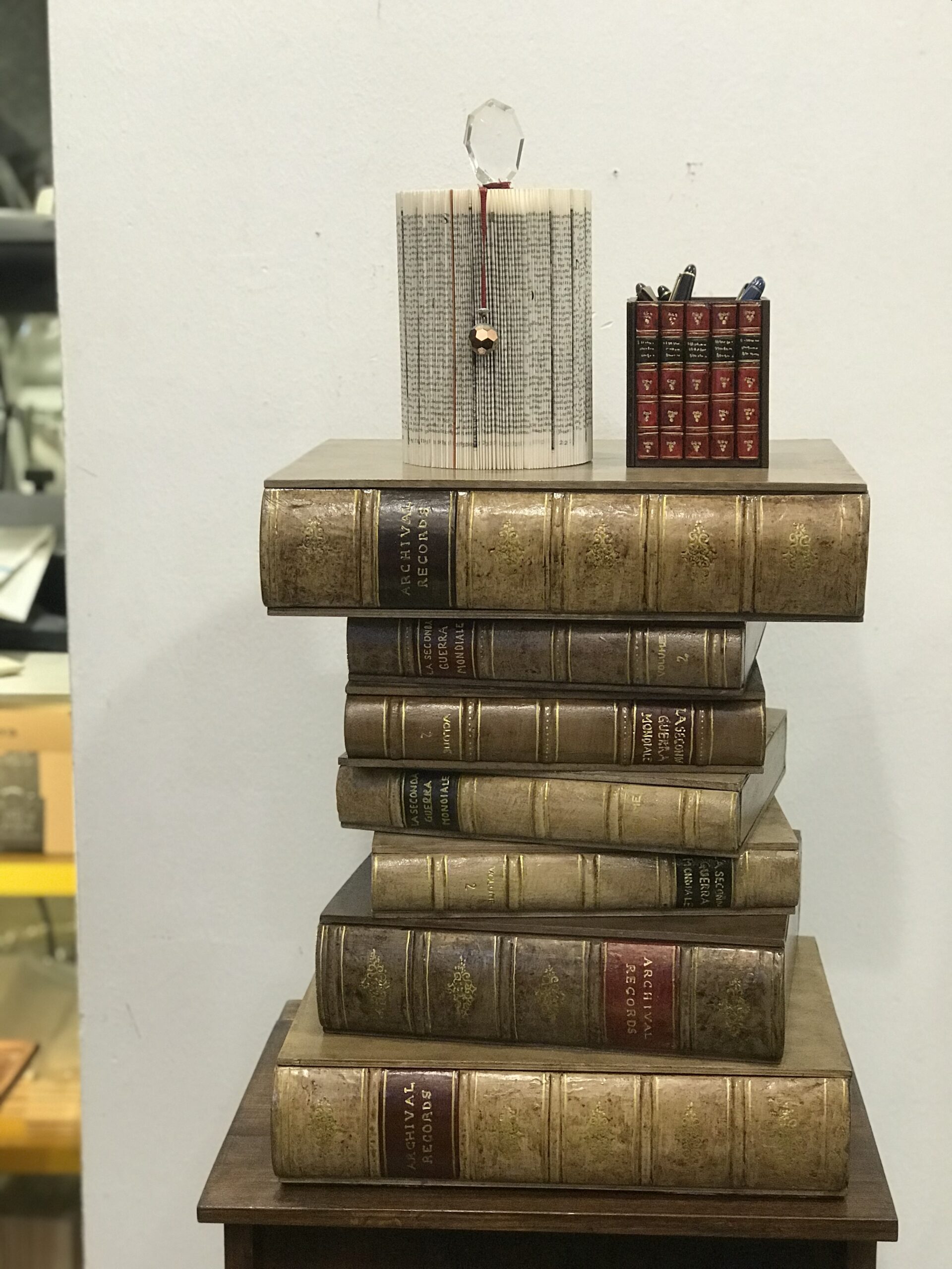 Comodino o tavolino per divano composto da 7 libri fatti di legno e gesso dipinti a mano. Il primo libro è apribile formando un contenitore porta oggetti.
