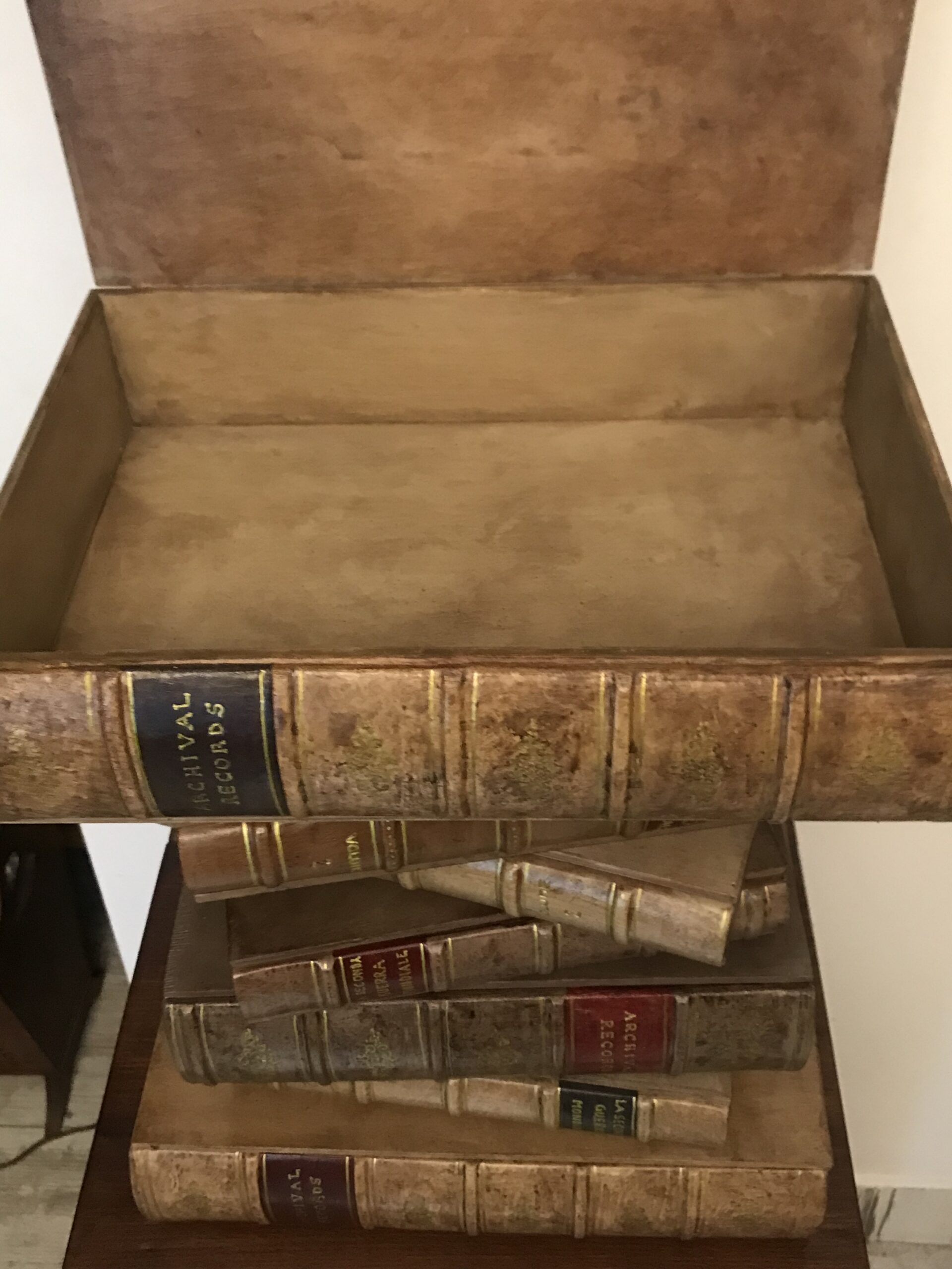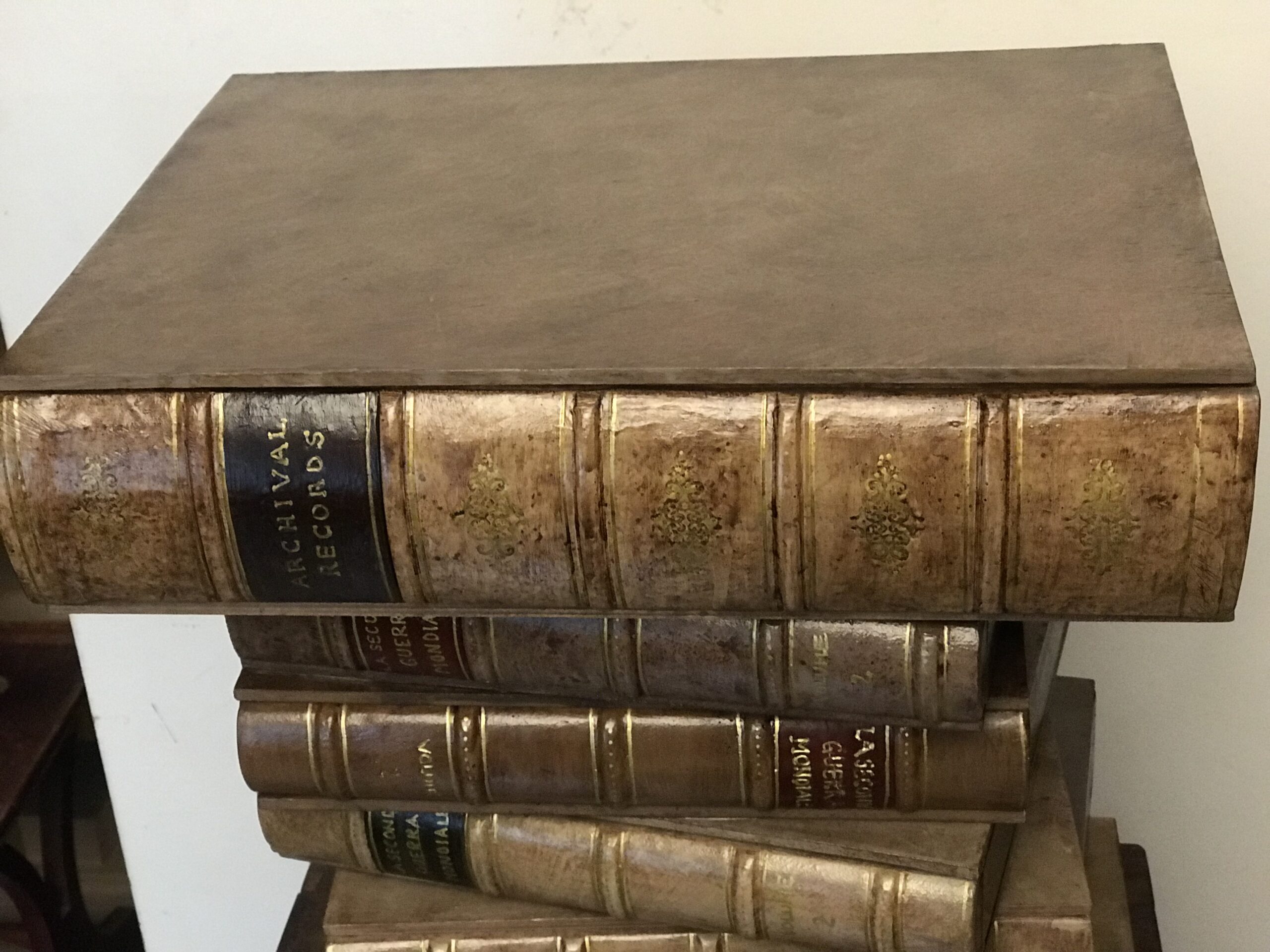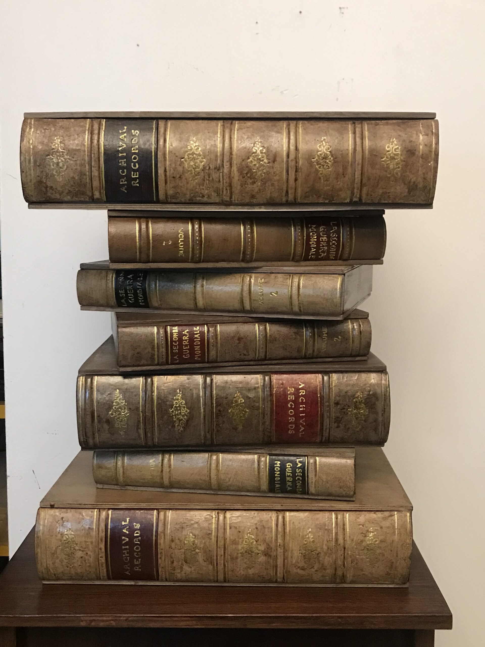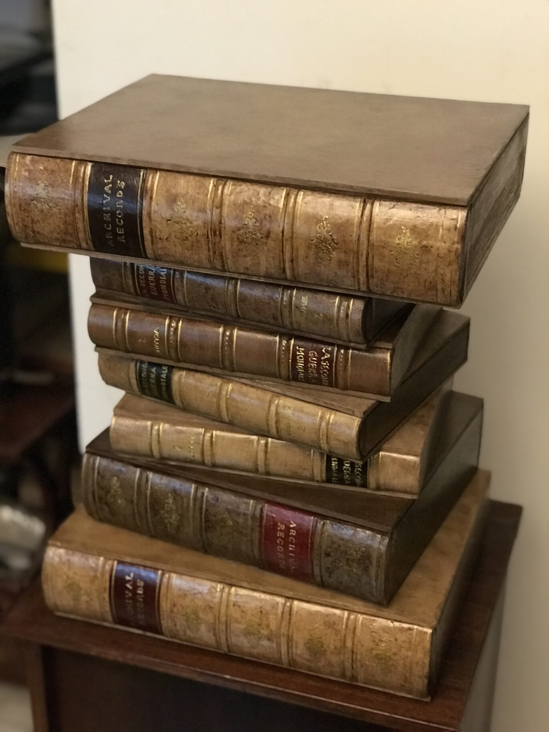 Comodino o tavolino per divano composto da 7 libri fatti di legno e gesso dipinti a mano. Il primo libro è apribile formando un contenitore porta oggetti.