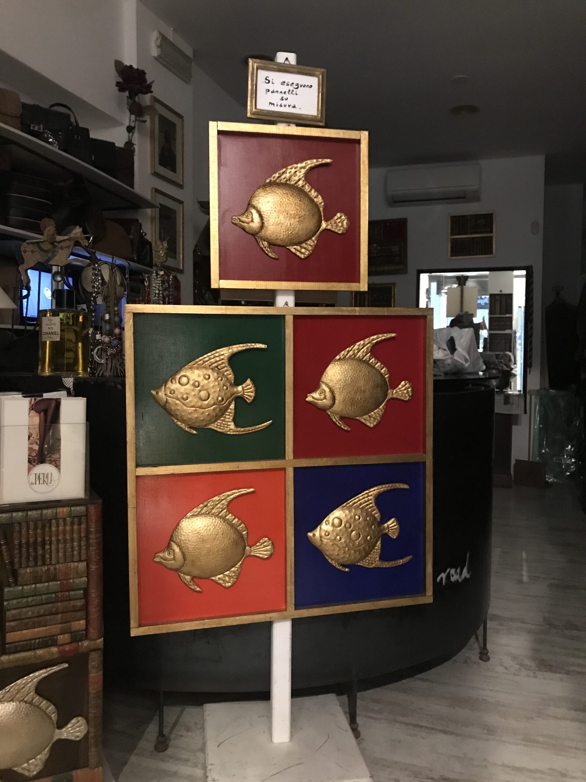 Quattro pesci e cornice dorati a foglia ,con sfondo colorato (acrilici). Verniciatura finale